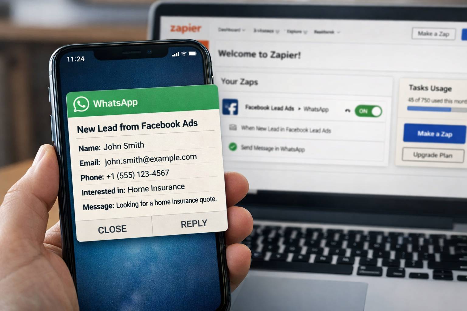 Masalahnya, antarmuka Facebook Lead Ads tidak built for speed. Anda harus login, download CSV, atau cek email notifikasi yang delay-nya bisa 15-30 menit. Zapier menghilangkan semua gesekan ini. Setiap kali ada yang isi form, dalam 1-2 menit, notifikasi WhatsApp sudah diterima sales dengan semua data yang dibutuhkan.