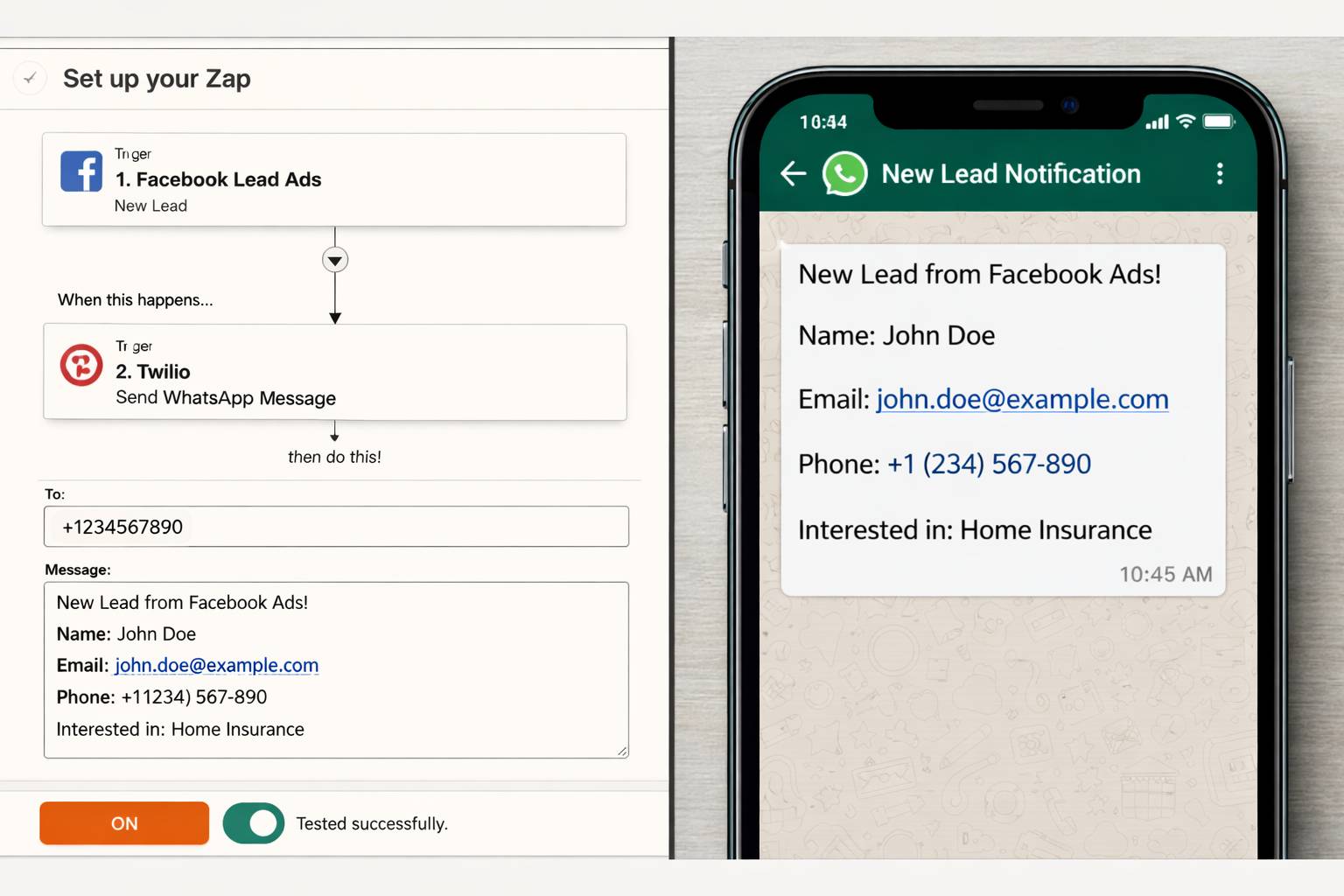 Map setiap {{1}}, {{2}} dengan data dari trigger Facebook Lead Ads. Test action. Kirim test lead. Jika sales menerima WhatsApp dalam 30 detik, Anda berhasil.