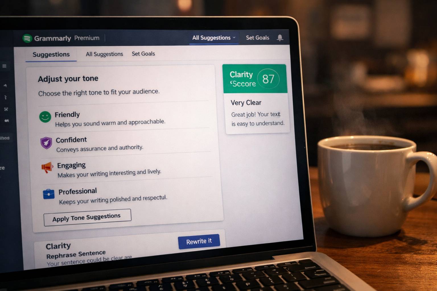 Grammarly gratis cukup buat nangkep typo dan error gramatikal dasar. Tapi sebagai professional writer, kamu butuh lebih dari “correct”—butuh compelling. Premium menawarkan tiga pilar utama yang nggak bisa diakses di versi free: Clarity, Engagement, dan Delivery suggestions.